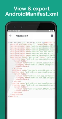 Installed apps can be saved to device storage and shared. App icon can be saved as well! App decodes the main metadata file AndroidManifest and saves it as a readable xml to an external storage.