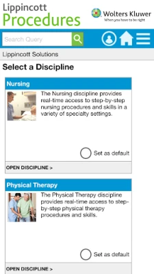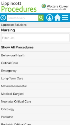 Great as a back-up in case of Internet outage, or for staff, such as home health nurses, without access to a reliable Internet connection. The Lippincott Procedures app ensures that your staff will always quickly and easily find the step-by-step procedure instructions that they rely on today.