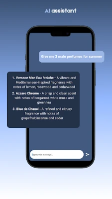 Need personalized advice? Chat with our AI perfume assistant to get instant fragrance suggestions tailored to your mood, preferences, and style. Ask for recommendations based on your favorite scents, get gifting ideas, or learn more about specific perfumes—all with the help of AI.