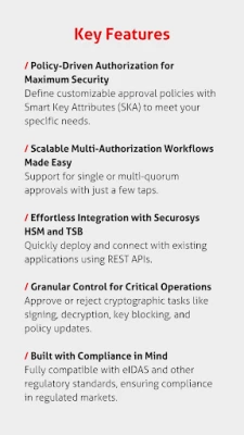 Important Note: The Securosys Authorization App works exclusively with the approval workflow engine (Securosys TSB), which integrates seamlessly with the Securosys HSM.